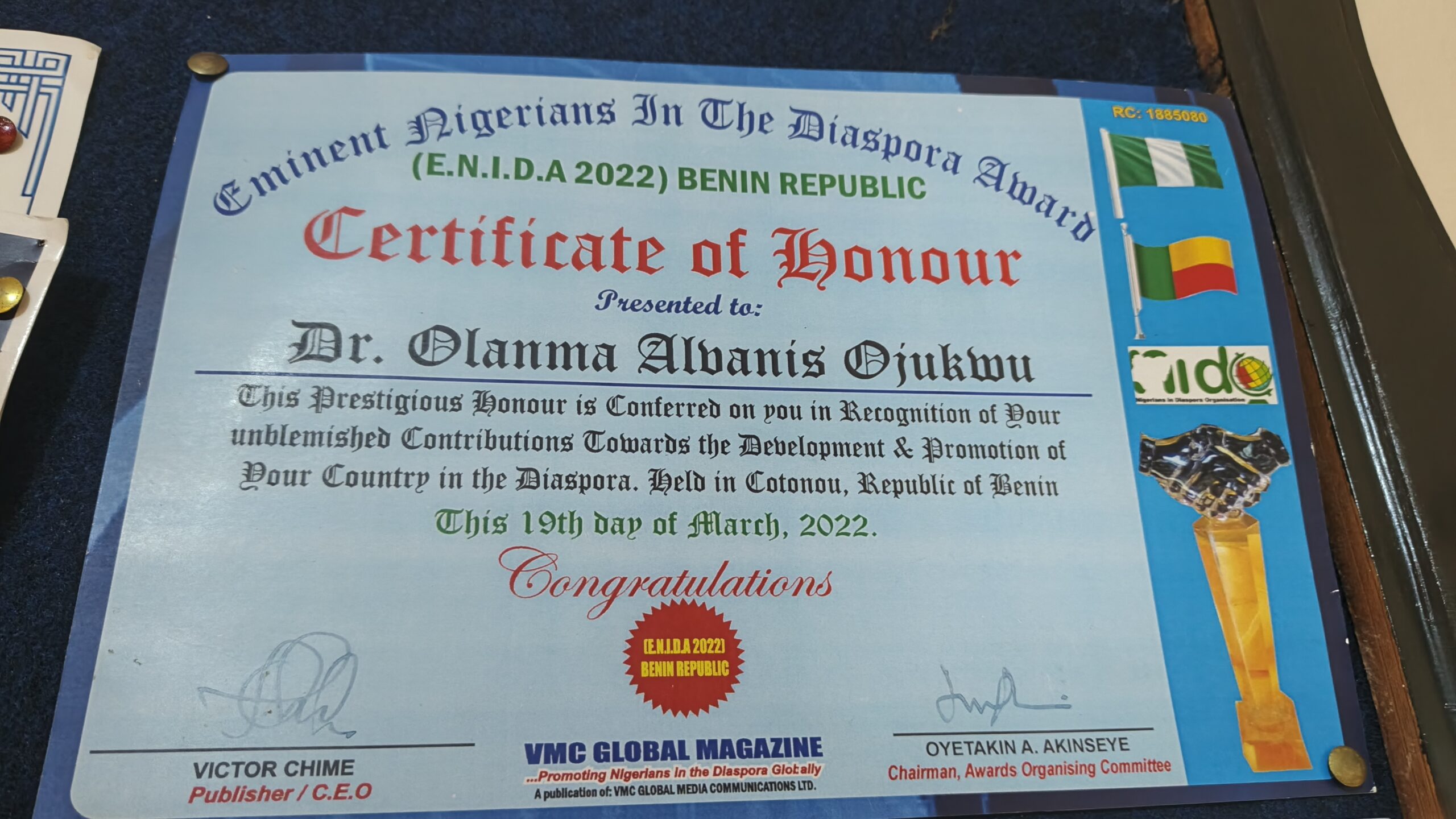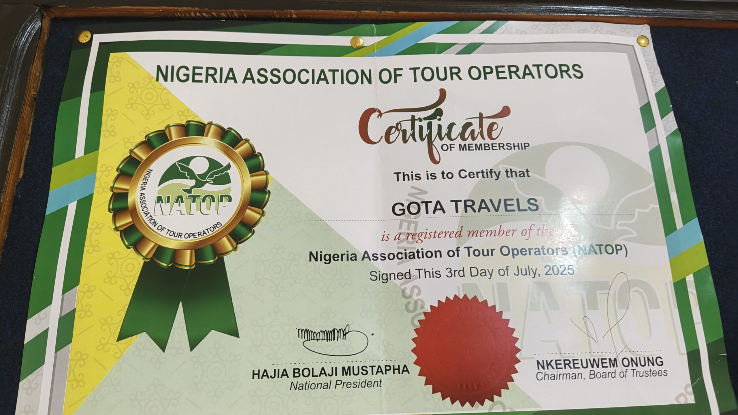 Fondé et enregistré en République du Bénin depuis avril 2009, le GROUPE GOTA INTERNATIONAL détient le numéro d’enregistrement RCCM RB/COT/09 A 6641 et de la licence du Ministère du Tourisme du Bénin 202/MAT/DC/SG/DPET/SRFP/SA.